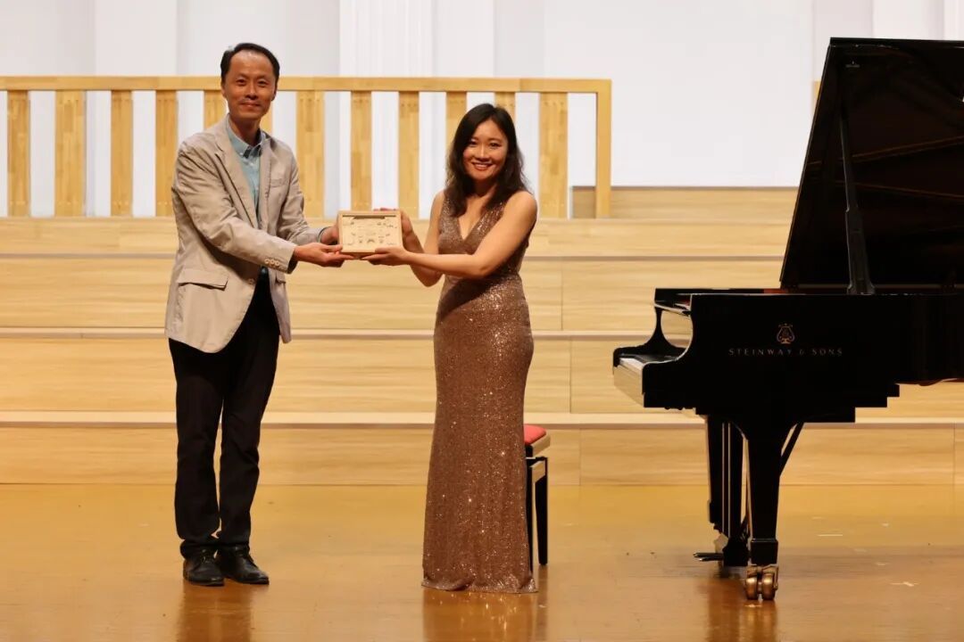 betway必威西汉姆联官网副院长王新代表学院向石文婷赠送纪念品,感谢她为betway必威西汉姆联官网青年学子树立的学习榜样,以及她以自己的学习成果回报祖国、回报家乡的爱国情怀。两份荣誉不仅是对钢琴家石文婷艺术成就的充分肯定,更是对她多年来在钢琴演奏领域持续耕耘、在艺术道路上不断追求卓越的真诚致敬。
