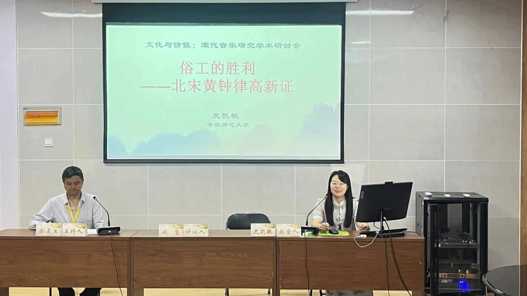 安徽师范大学史凯敏副教授的发言题目为《俗工的胜利——北宋黄钟律高新证》。史老师在前辈学者对历代黄钟律音高研究基础上,考虑到律管豁口对音高的影响,通过实验提出,豁口是判定律管吹奏方法的核心依据,也是考证历代黄钟标准音高的重要参数。进而,根据史料记载的宋代乐尺分别制管验声,却发现大晟尺黄钟律高平均为#D5-37,与大晟钟实际测音音高并不相符。通过系统梳理大晟律推行前,宋人对律制音高的细节调整,发现“依声定律”理念贯穿始终,点明了乐工实践对乐律调整的重要作用。她认为,由于政治因素,大晟尺与大晟钟律高无关,乐器实践实则由乐工主导,依杨傑律林钟为大晟乐定音校律。